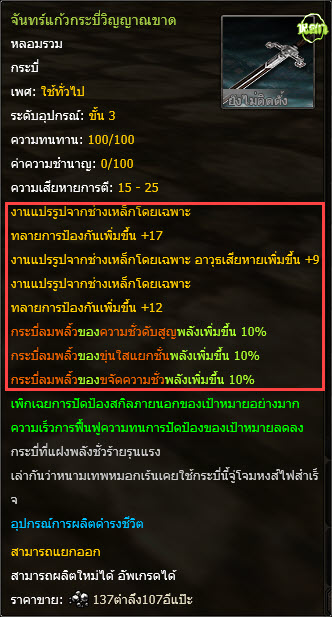 - วัตถุดิบที่ใช้ในการเปิดออพชั่น ได้จากกล่องที่แถมมา "วัสดุเจิดจ้าขั้น3" ยกเว้น ถ้าเป็นอาวุธประเภท "สนับมือ" จะใช้วัตถุดิบอื่น ที่แตกต่างออกไปจากข้างต้น ผู้เล่นจะต้องหาวัตถุดิบเพิ่มเอาเอง