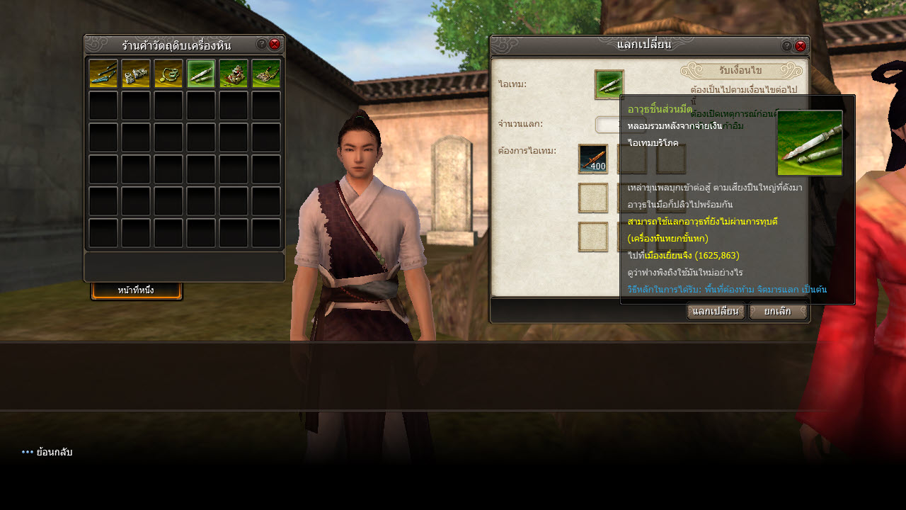"อาวุธปลายม้วน(ตงง้วน)" นำไปแลกเป็น อาววุธ หยก ขั้น3 ได้ที่ เมืองลั่วหยาง 290 570 พ่อค้าสิ่งของตงง้วน(อุปกรณ์) (ออพชั่นพ่อครัว, ช่างเหล็ก ระบบจะสุ่มให้เอง ไม่สามารถเลือกได้)