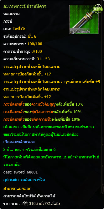 "ห่อเสริมอุปกรณ์" จะยังเหลือวัตถุดิบอีกหนึ่งชิ้นนั้นก็คือ กระบี่ยันหยางบริสุทธิ์ *400 หากต้องการอัพเกรดต่อไปยังขั้น 6 ก็ให้นำไปแลกเป็น "อาวุธชิ้นส่วนมีด" (จุดเซฟซูโจว) เพื่อทำการแลกแปลนขั้น 6 ต่อไป (เยี่ยนจิง 1625 863)