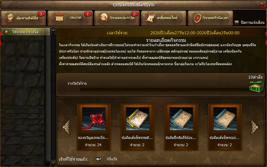 - เมื่อหมดเวลากิจกรรมไปแล้ว หน้าอินเตอร์เฟสกิจกรรม จะยังคงอยู่อีกสักระยะหนึ่ง ซึ่งระบบหยุดทำงานตามเวลากิจกรรมไปแล้ว ขอให้ผู้เล่นระวังตรงจุดนี้ให้ดี จะไม่มีการส่งของรางวัลแต่อย่างใดแล้ว
